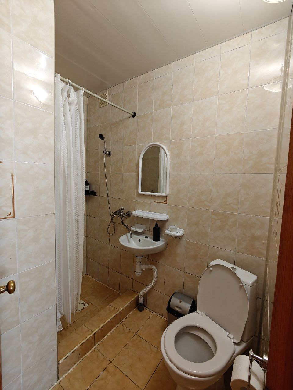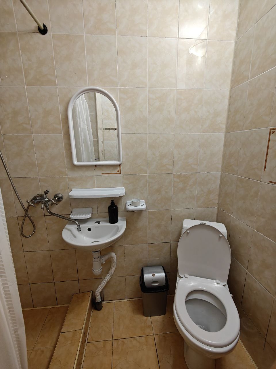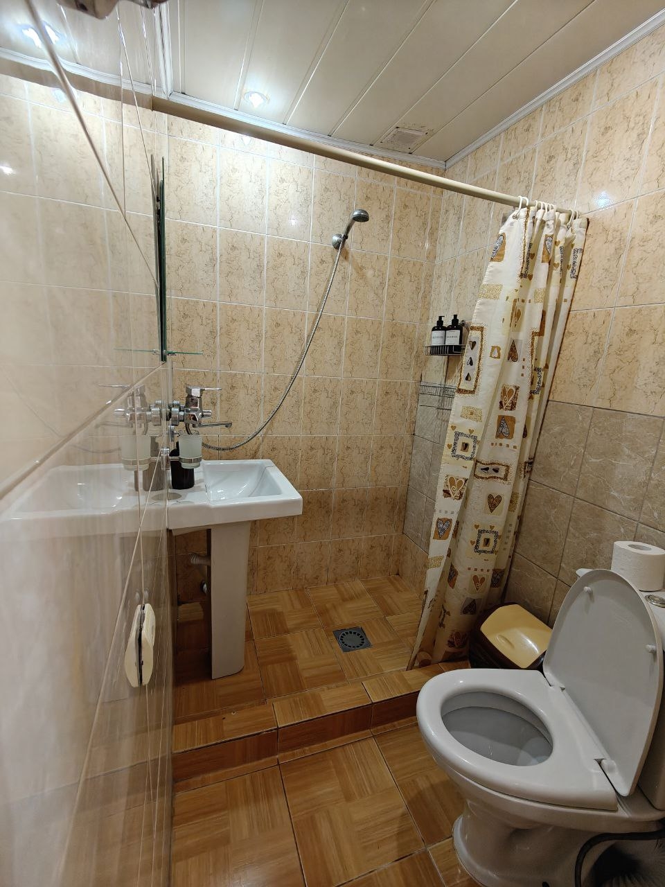 Индивидуальная ванная комната: душ, раковина, туалет.